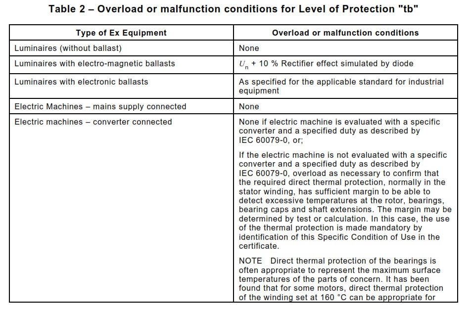 Secondo il punto 4.3.5.1 della norma IEC 60079-31:2013 (ora ritirata), è richiesto l'utilizzo di un dispositivo di protezione per tutte le apparecchiature elettriche con grado di protezione Ext, in grado di superare la temperatura superficiale massima a seguito della prova di temperatura; tuttavia,